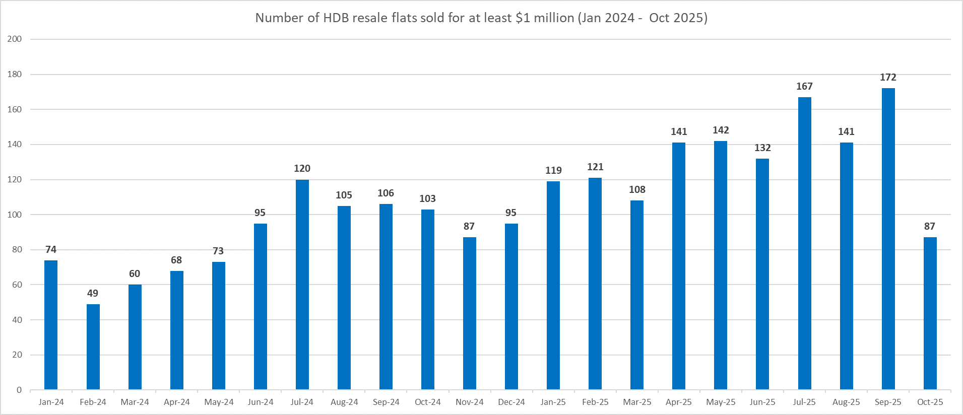 Chart 3: Number of HDB flats resold for at least $1 million by month